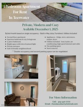 ✨ Executive 1-Bedroom Furnished Apartment – Teeswater, ON ✨ Available Dec 1 ✨ Bright, airy, and beautifully furnished—this executive 1-bedroom apartment is perfect for professionals working...